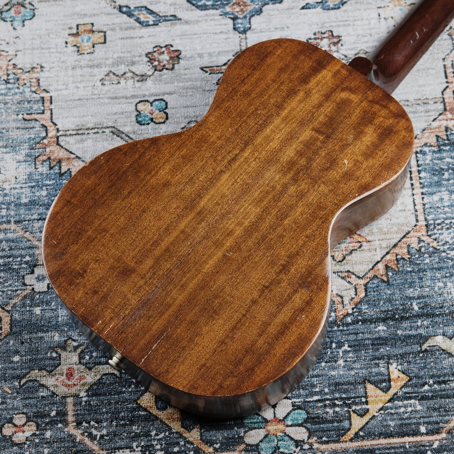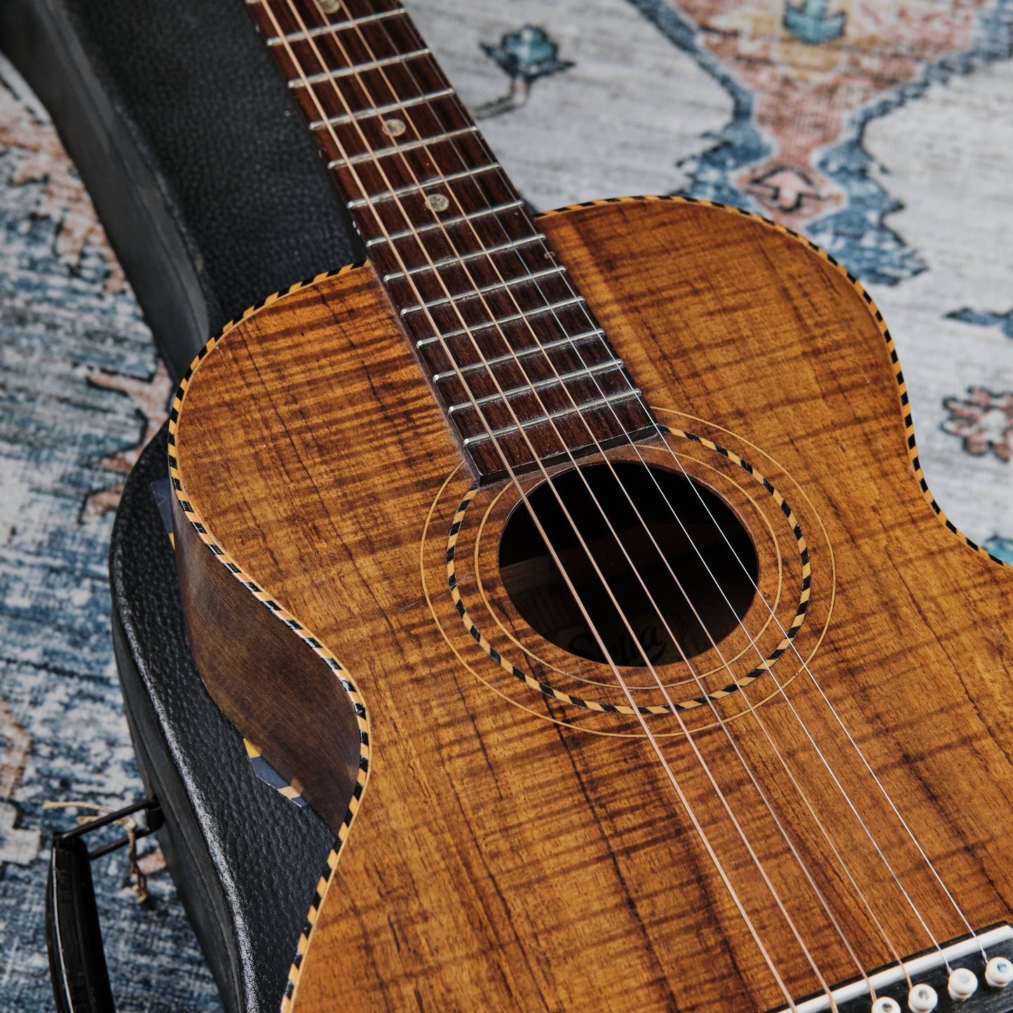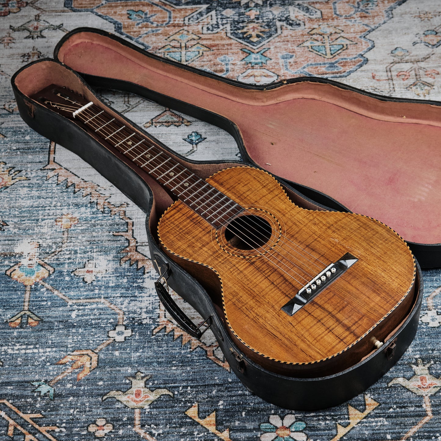 This particular model is a compact parlour shape, made of Koa. Koa originates from Hawaii and is known for sitting sonically somewhere between maple and rosewood, specifically highlighted for its unique tonal properties once properly played in. This particular example has an incredible sound. Super articulate, balanced, and with a low-end that completely defies its size. Neck is a deep V, which is representative for many guitars around this time.