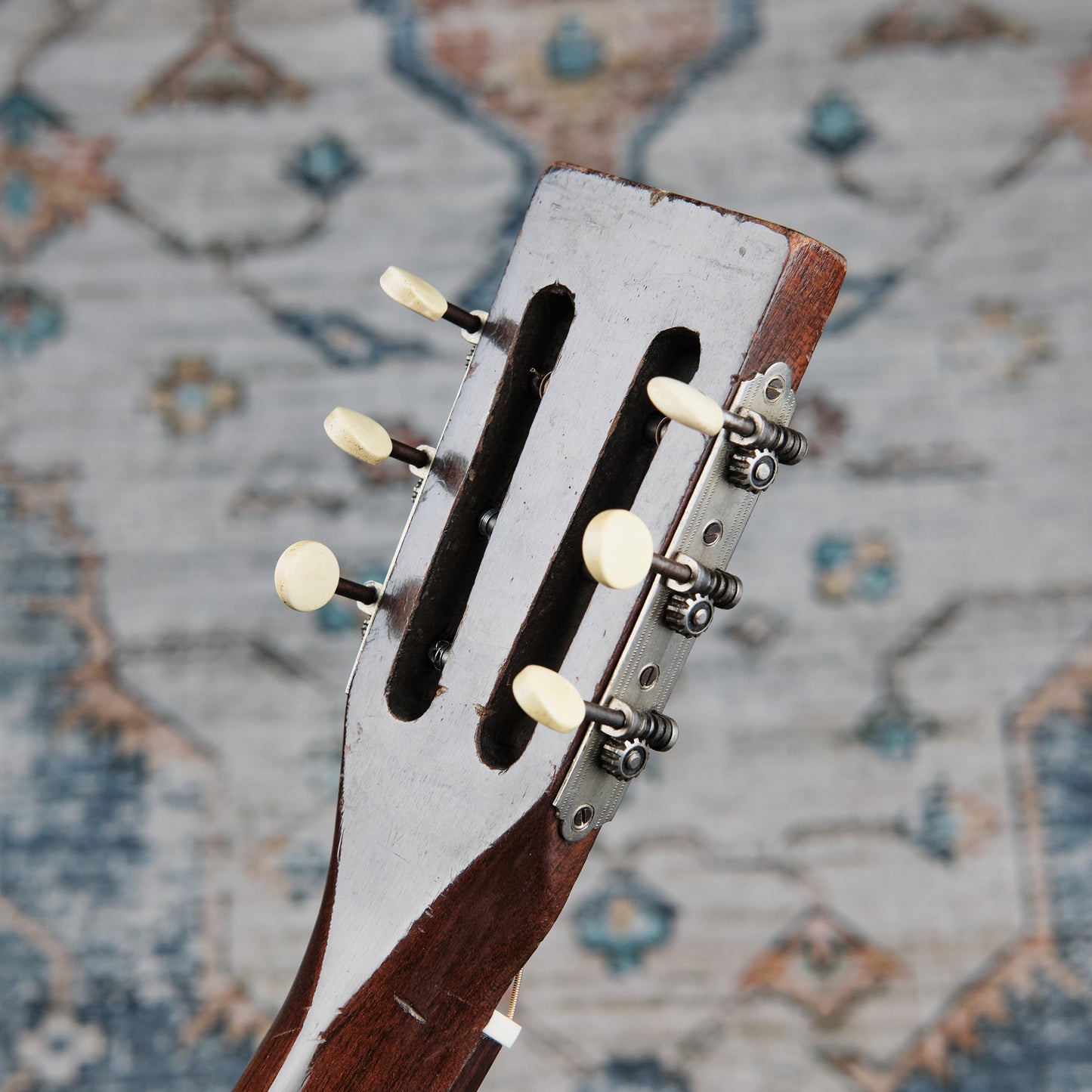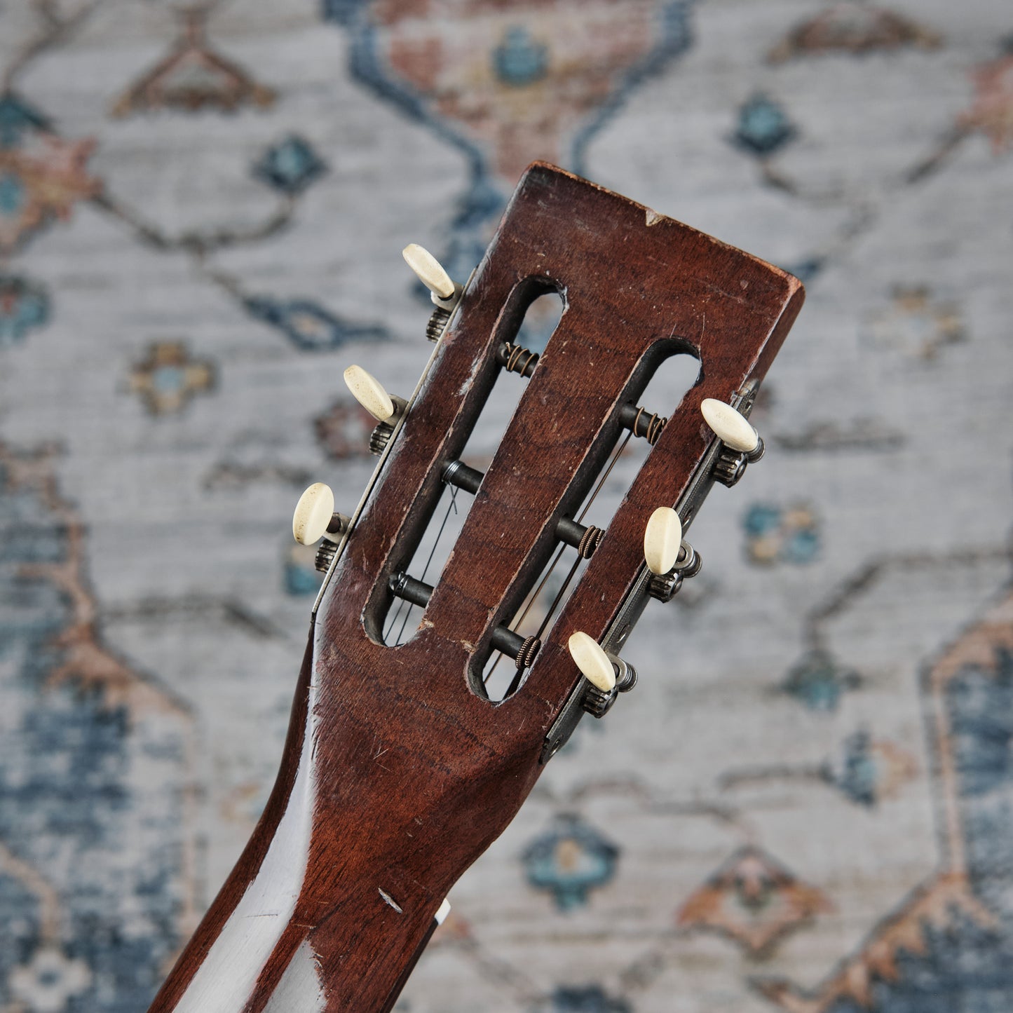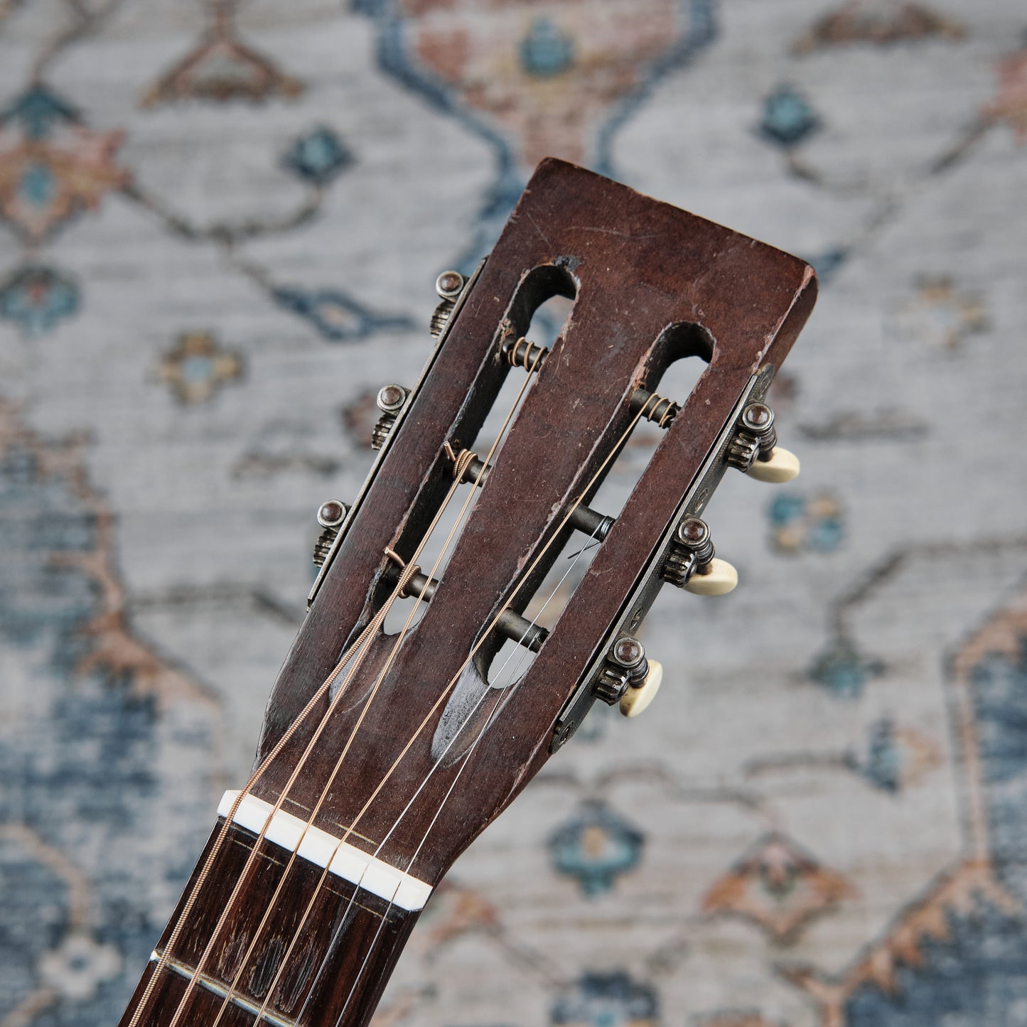 This particular model is a compact parlour shape, made of Koa. Koa originates from Hawaii and is known for sitting sonically somewhere between maple and rosewood, specifically highlighted for its unique tonal properties once properly played in. This particular example has an incredible sound. Super articulate, balanced, and with a low-end that completely defies its size. Neck is a deep V, which is representative for many guitars around this time.