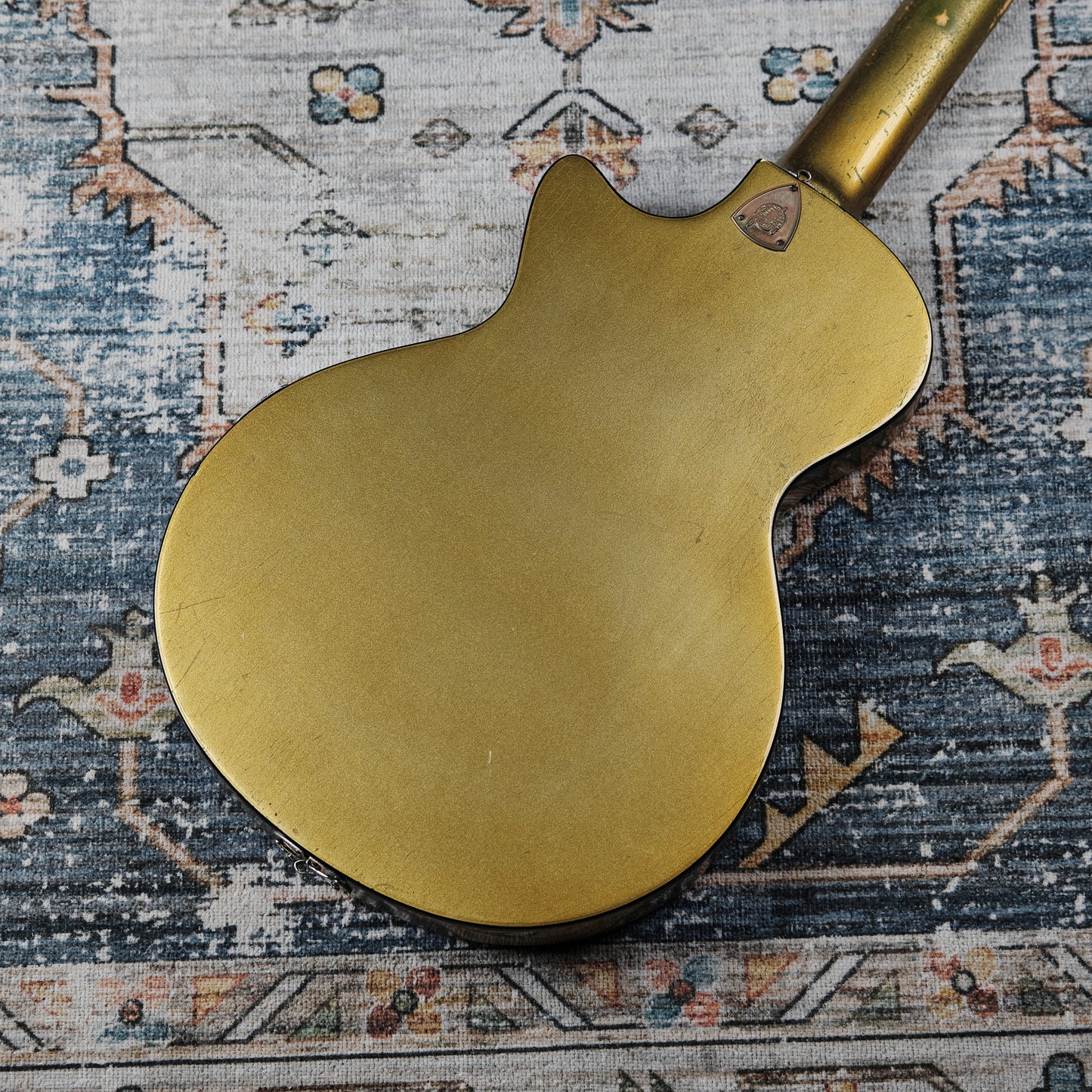 Finished in metallic gold, this example has aged graciously, acquiring super unique patina and checking wear throughout. The tuners and tailpiece are non-original, but have been replaced with period and model correct parts. Throaty and mid-focused unplugged, this example really shines plugged in, benefitted by a low-output and vastly characterful pickup.