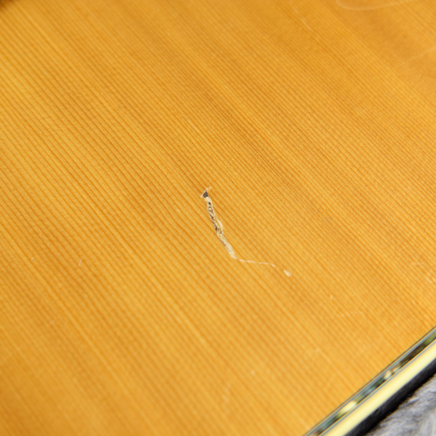 Cosmetically, this example has been well-loved with numerous scratches, dings, and marks found throughout. Some prevalent scratching can be found on the lower bout. There is one noticeable gouge in the top, however it appears completely stable. Hardware is fully functional, and plays with a medium action. Includes what appears to be an non-original hard case.