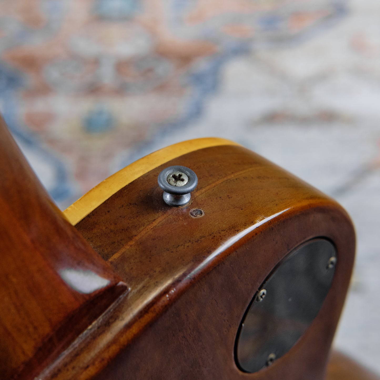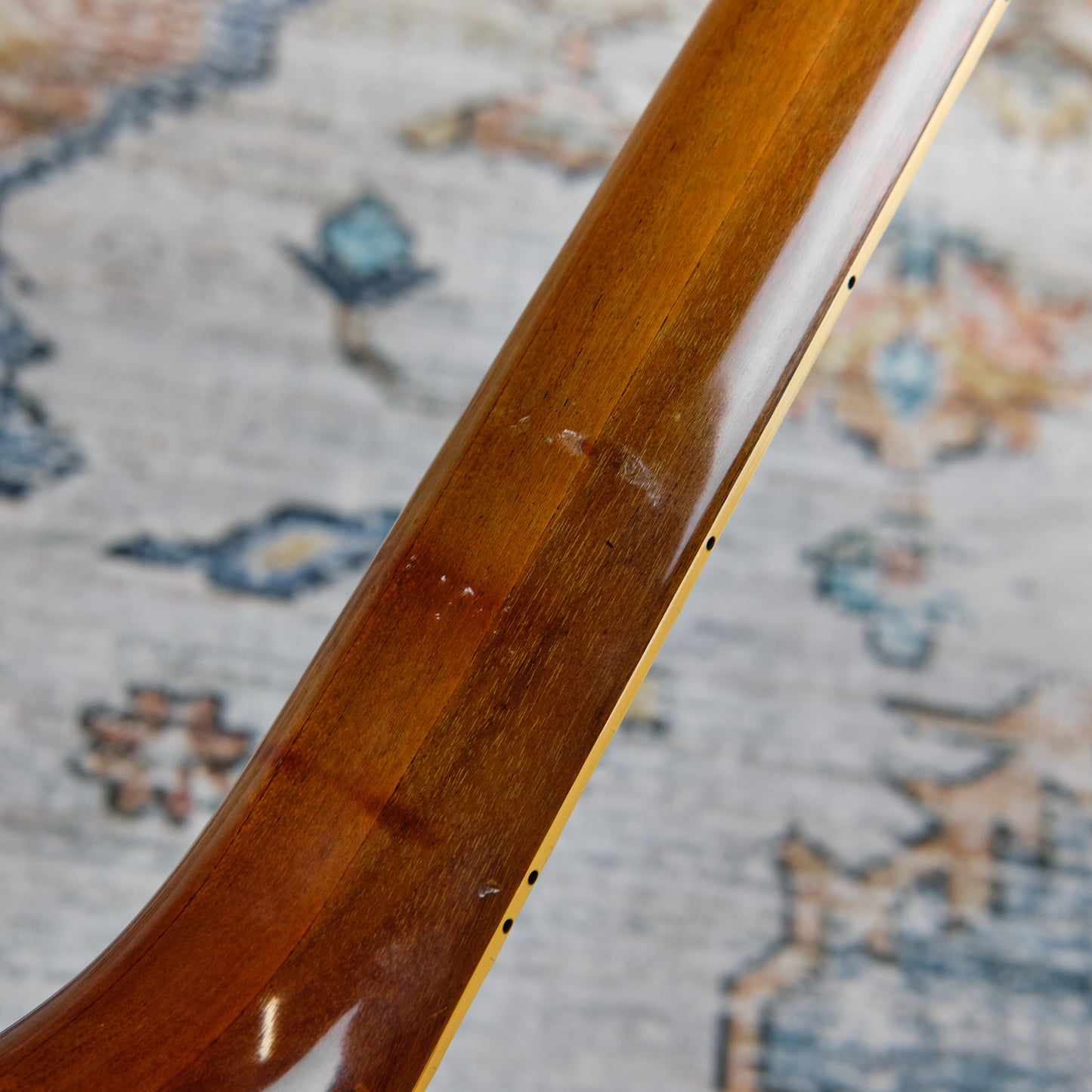 Hardware is all functional, with the only predominantly noticeable damage being a chip on the back of the left horn of the headstock as well as a moved strap pin (see photo).