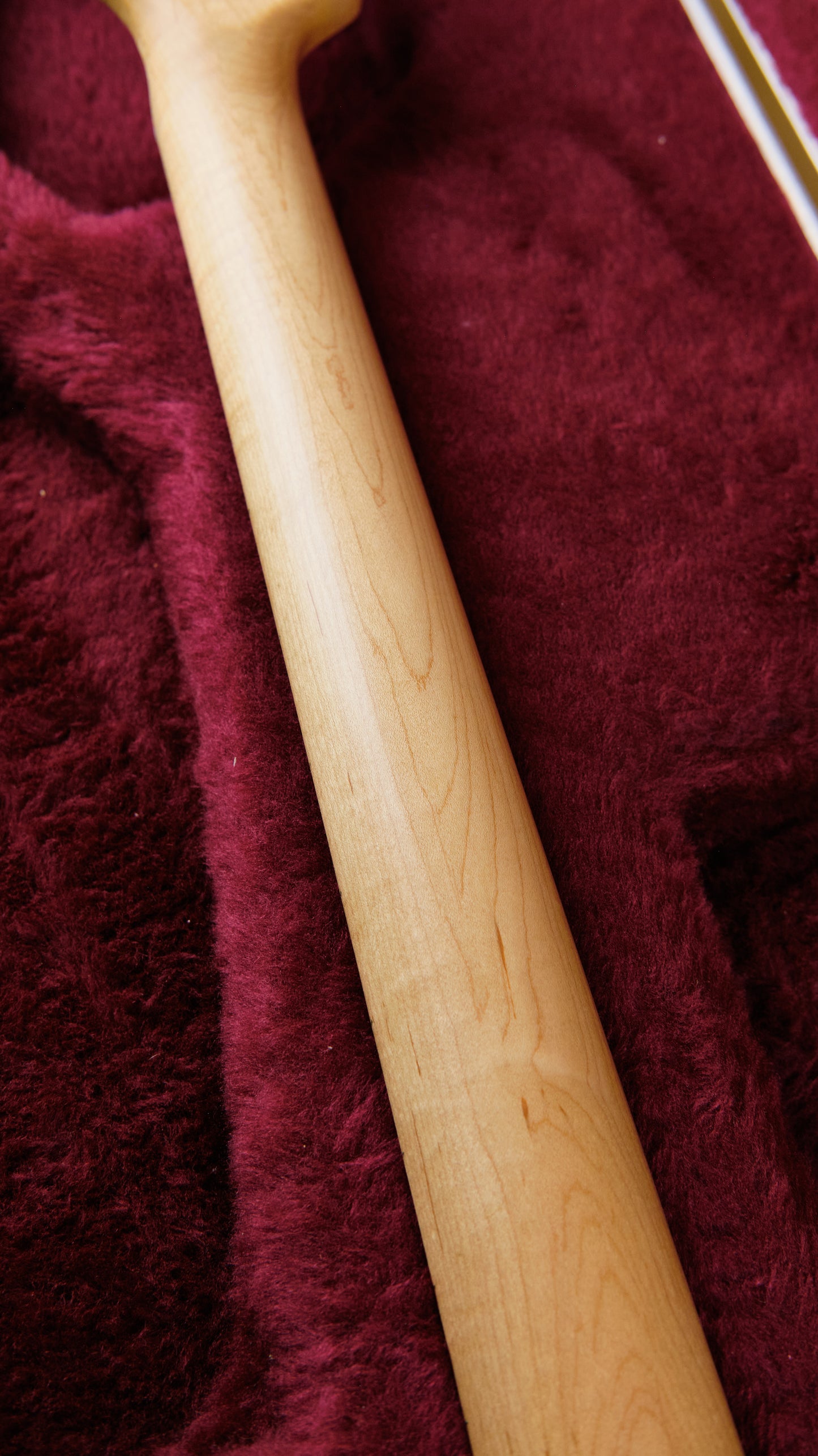 Cosmetic condition is reasonable with minor scratches and swirl marks throughout. At some stage the pickguard has gotten a bit of sun exposure and has faded the guard, leaving behind the outline of a sticker. Hardware is fully functional, and plays beautifully with a low action and a recently installed set of Ernie Ball Bass Super Slinky strings. Includes the original hard case.