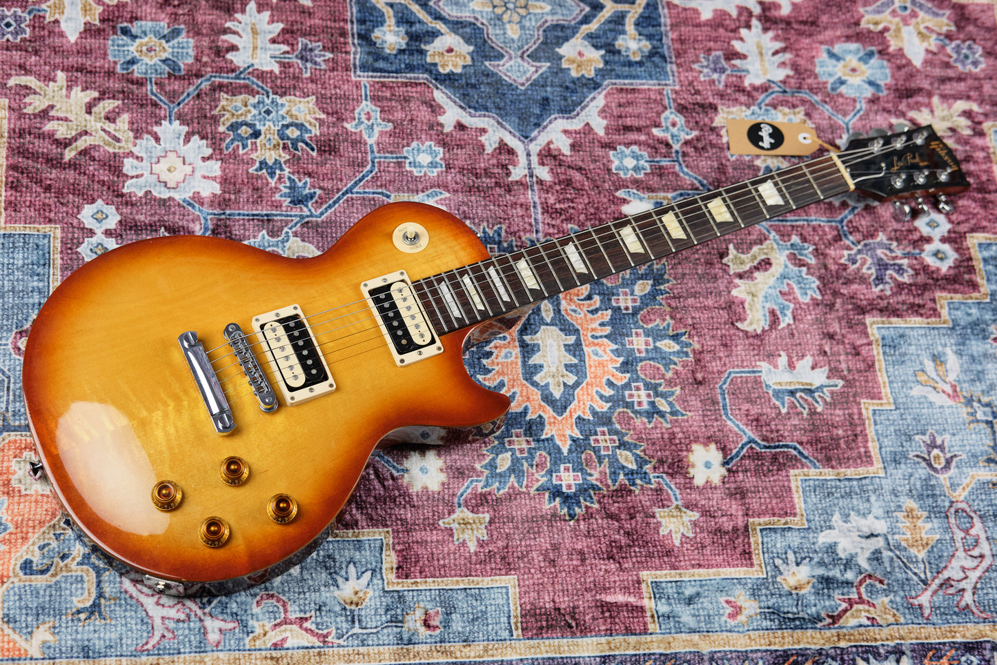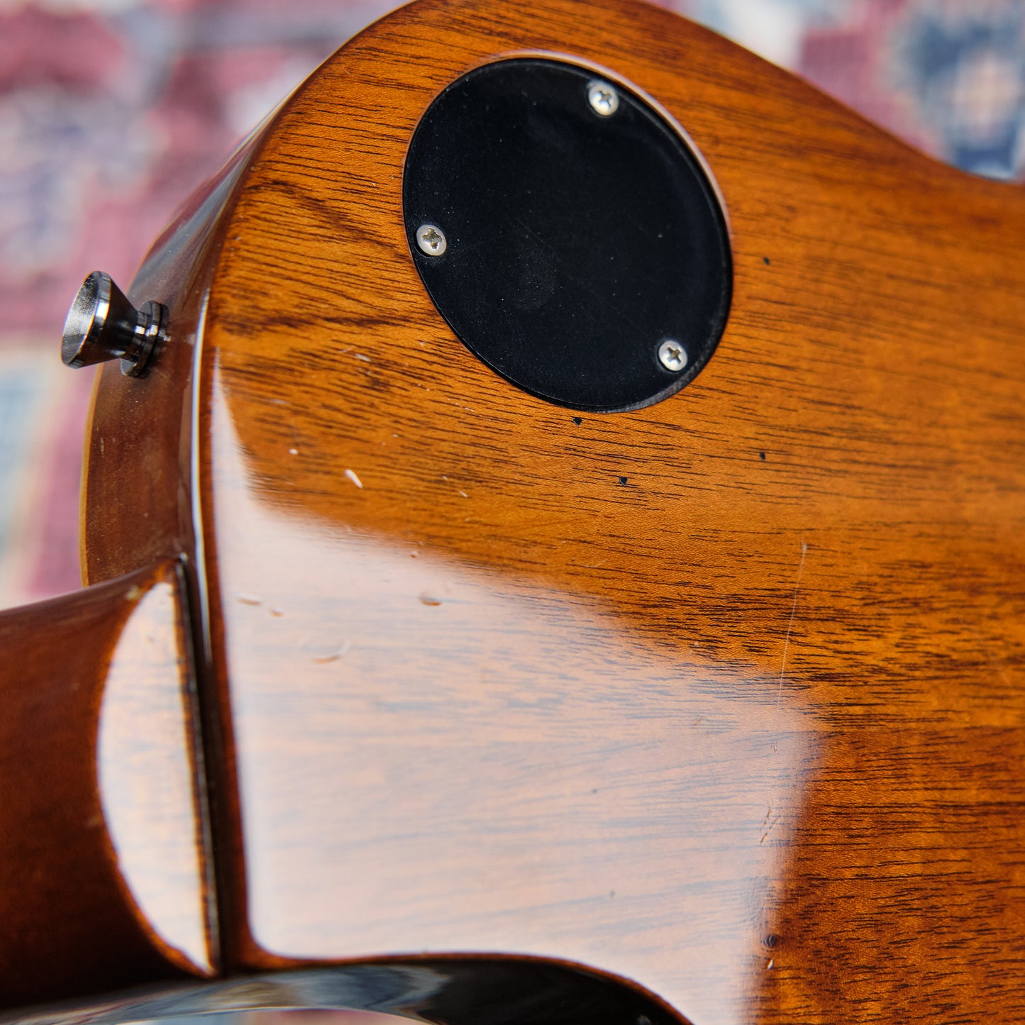 Coming from the Studio line, this example eschews the conventional binding for a simpler look with both the body and neck lacking the binding found on higher end models. Featuring a AA maple top which highlights the incredibly honeyburst finish, this example not only looks incredible but sounds excellent.