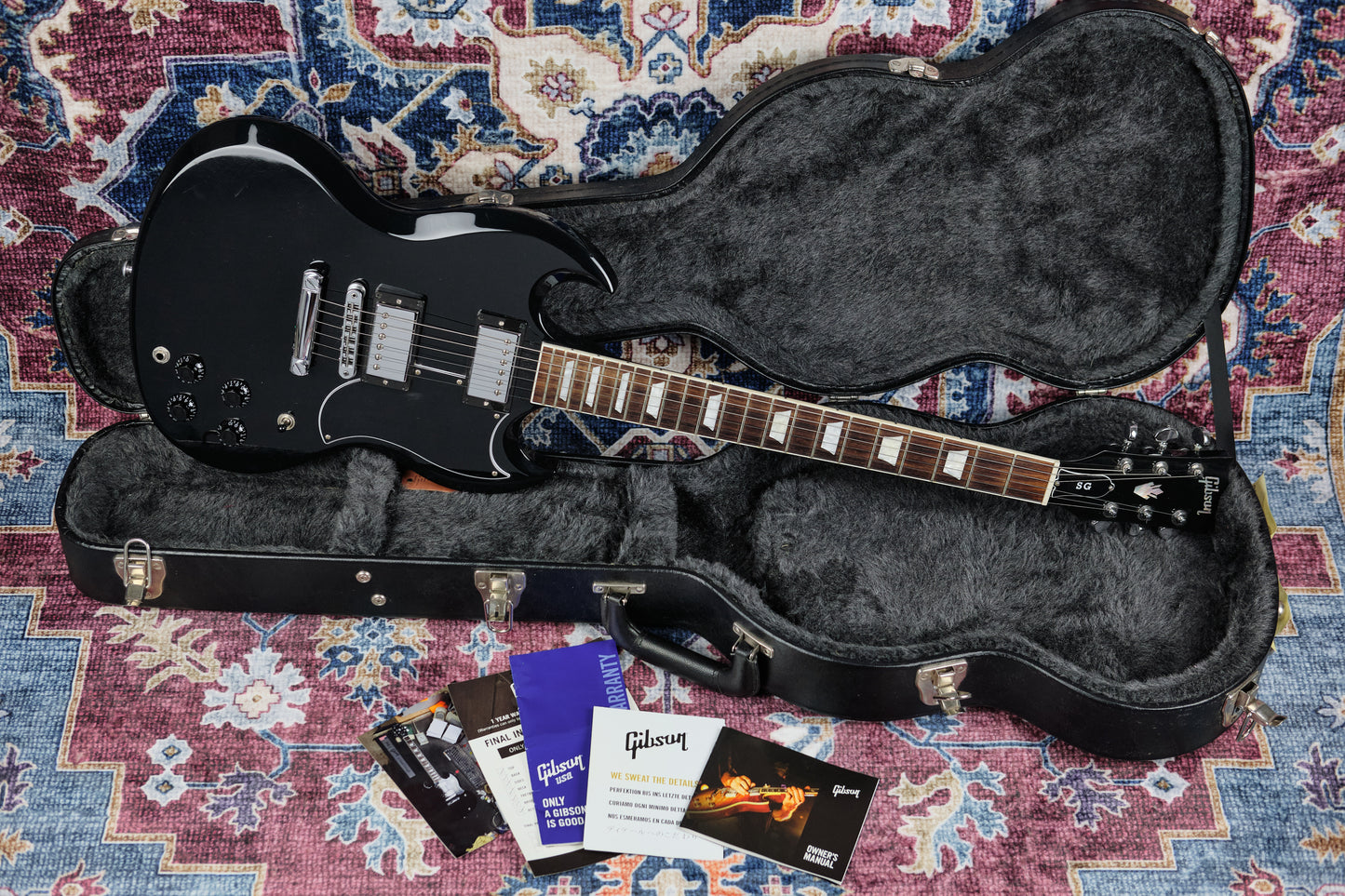 Manufactured in 2018 and finished in ebony, this example boasts the great sounding 61R/T pickups, the small '61-spec guard, and locking tuners. Mahogany body and neck, and a rosewood fretboard round out what you'd otherwise find on most other SGs. Has a nice spank when played unplugged, and sounds appropriately rockin' when plugged in. There's some neck dive present, but that's commonly the case with these.