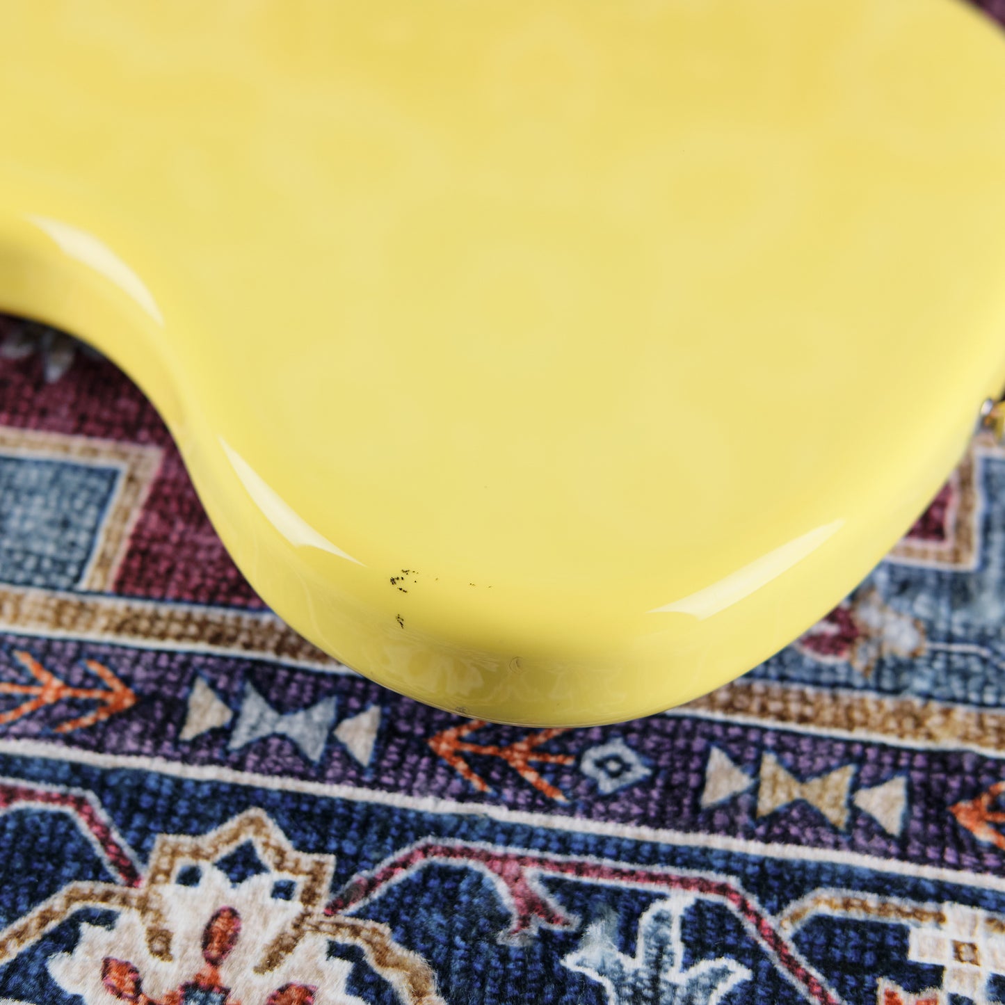 Cosmetic condition is good throughout with the usual pickguard scuffing being present. There are also a couple of small dings and blemishs on the lower bout of the guitar. Is missing the gig bag and tremolo arm.