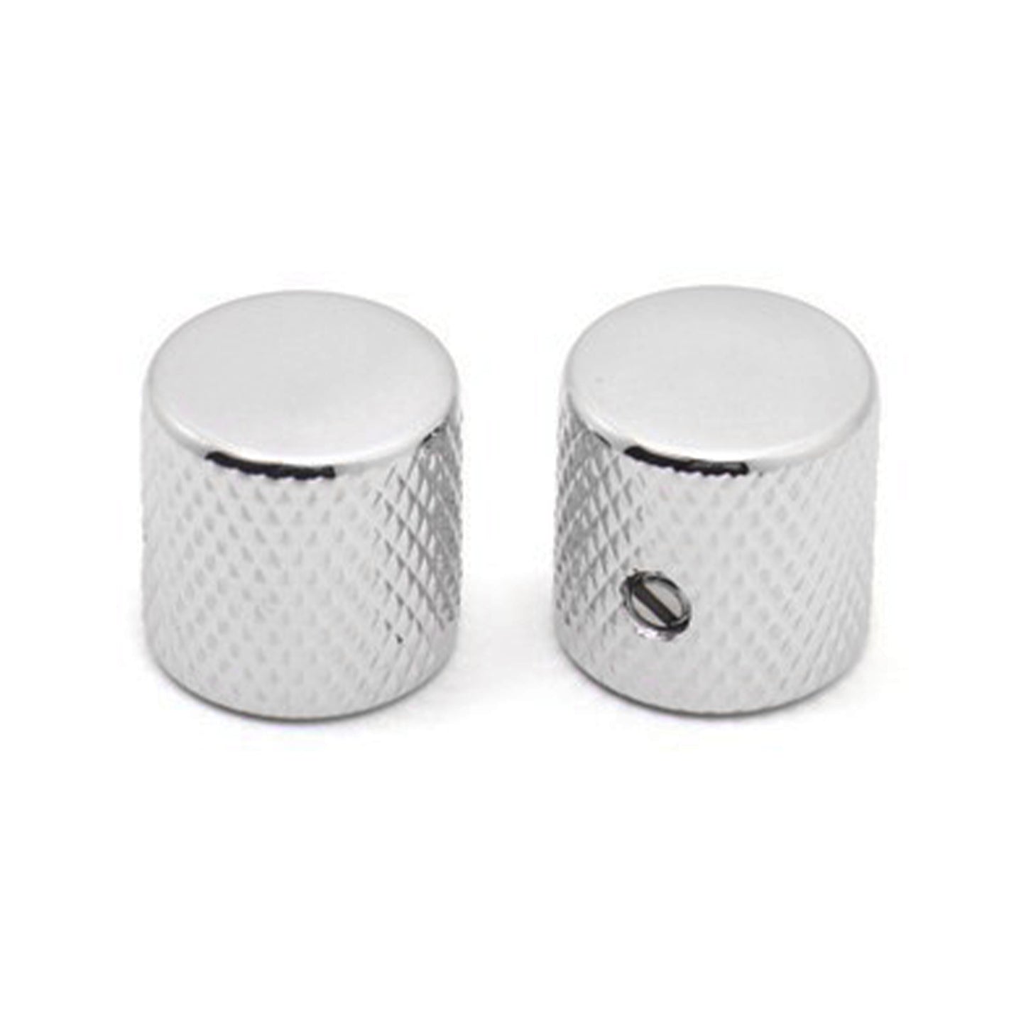 A set of 2 brass flat-top knobs with knurling and set screws. Known as the traditional barrel knob used on basses and many guitars.