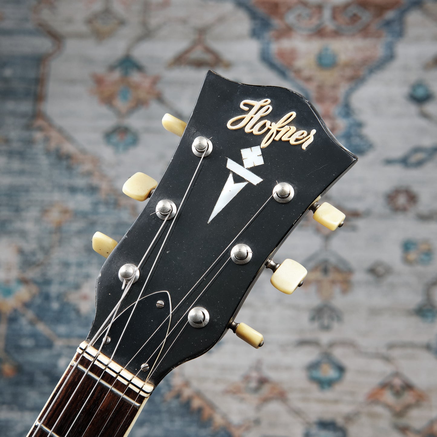 Produced between 1966-1970, the Hofner 4600/E2 was a German manufactured thin-line hollowbody, notable for its shallow body depth of 1 1/4"! Nice and resonant acoustically, as well as being super light to boot! Amplified, it has a prominent treble bite with great note clarity. This particular example has some finish checking throughout the body. It appears evident that the flimsy toggle switch had at some point been replaced with a more robust three-way toggle. Otherwise appears to be in original condition.