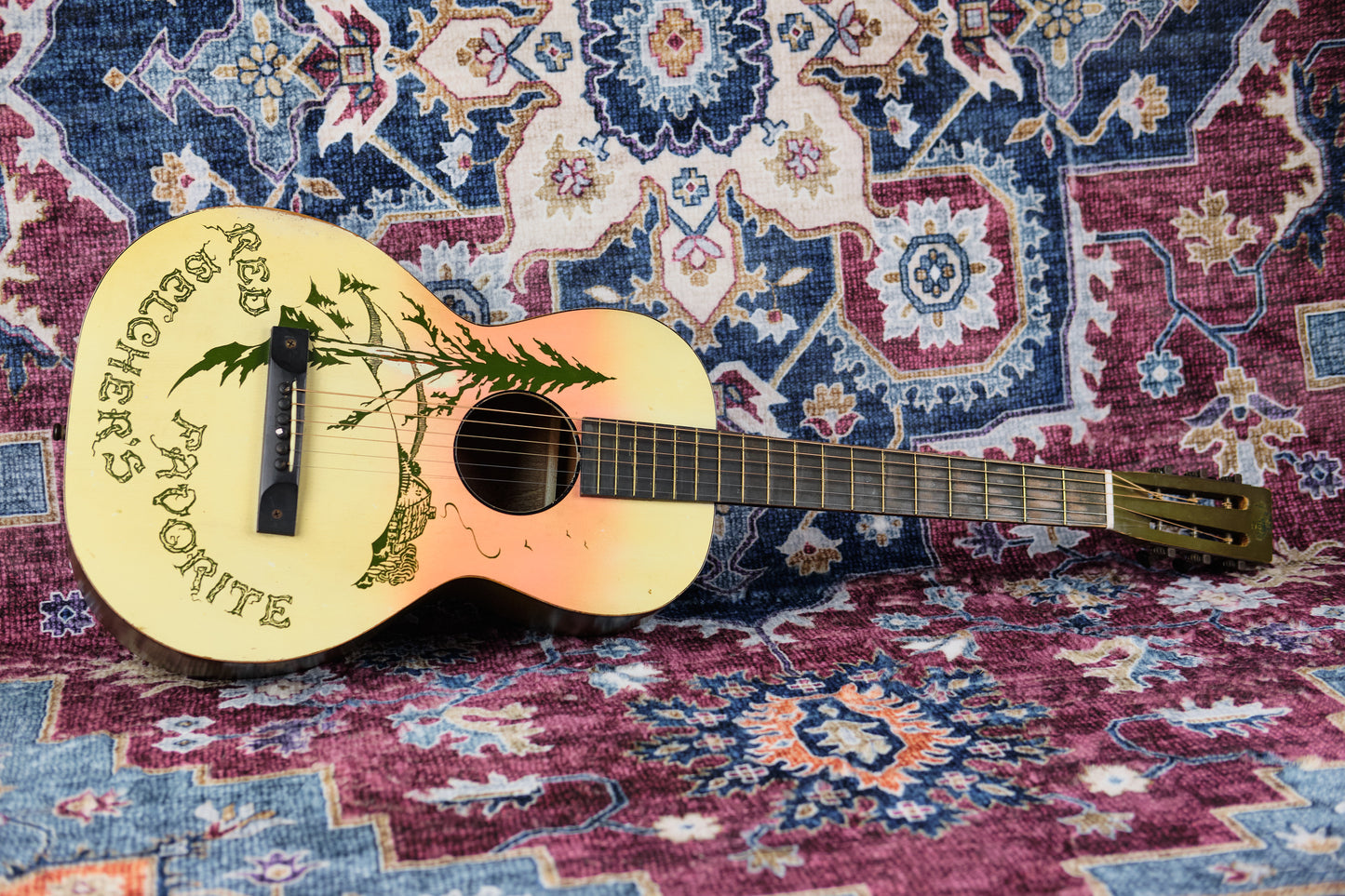 At some stage the guitar has been resprayed with quite an interesting graphic featuring the phrase, 'red belcher's favorite'. Based on the spelling of favourite, we can only assume who ever did the graphic was more than likely American.