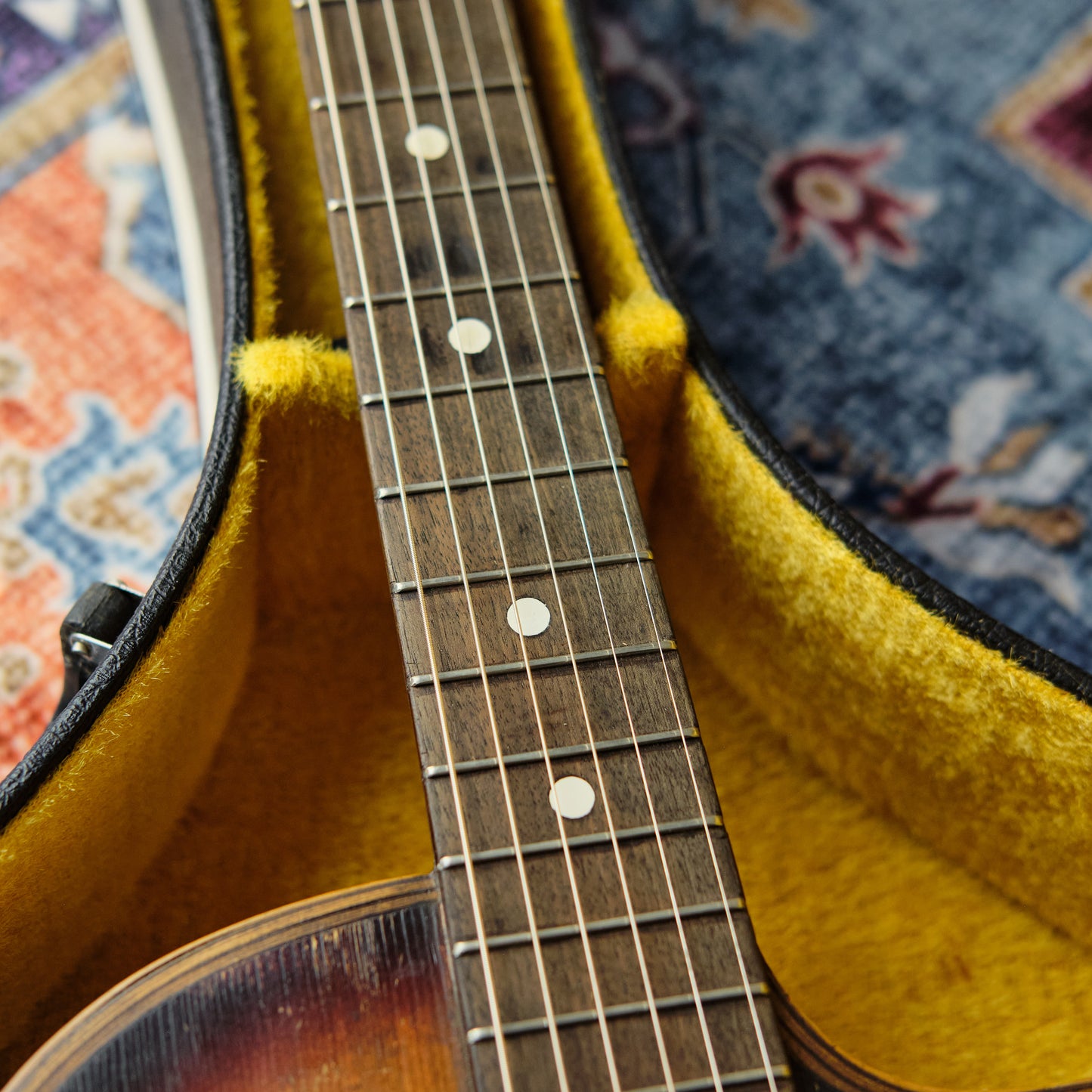 Manufactured by a luthier named Stefano Capponnetto in Catania in Sicily, this particular instrument would have been made sometime around the 1940s to 1950s. Built with a cutaway and designed in the folk/gypsy fashion, this particular example is extraordinarily light and sounds surprisingly big and authoritative for its size.