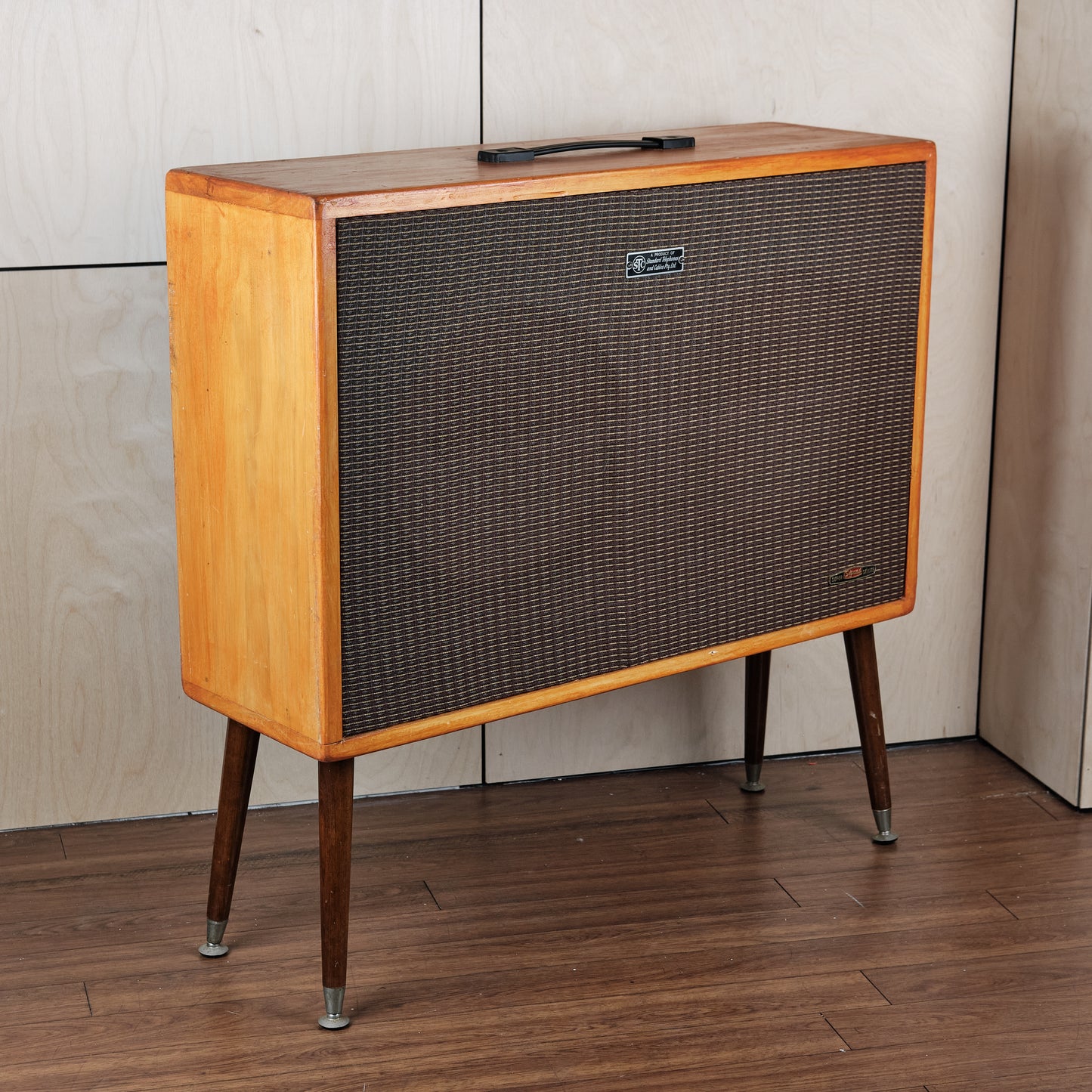 Awesome locally built cabinet, utilising a configuration of two early 1970s Plessey CP12P speakers, rated at 30 watts respectively. This example utilisises a full open back pine cabinet design, 8 ohm speaker input, and finishes off with a lovely set of old TV legs! Super vibey cabinet with a great sound!