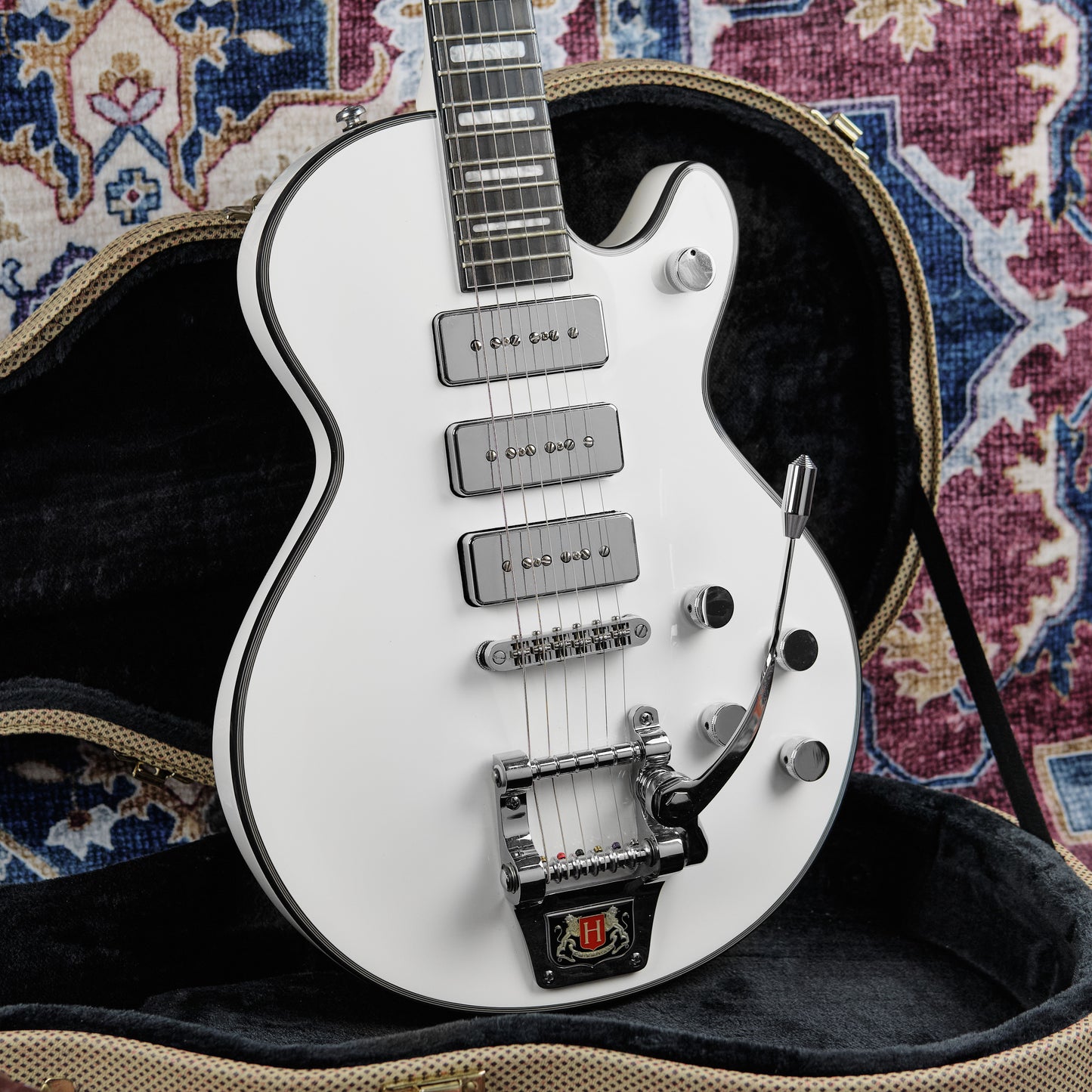 Boasting three P90 pickups specially designed to provide a hybrid single-coil/humbucking sound-palette, in tandem with a 6-way rotary switch, provides a wide gamut of possible tones whilst simultaneously capturing that raw, P90 magic. The Tremar vibrato system on these models is super smooth and fun to use, allowing for beautifully subtle pitch variations.