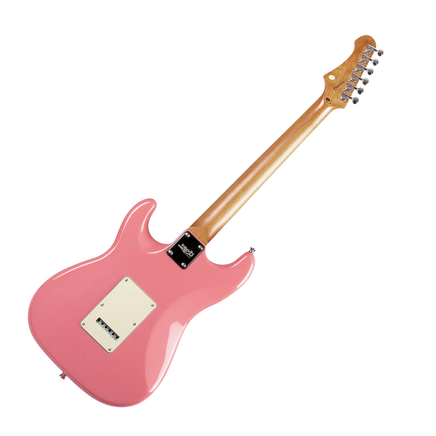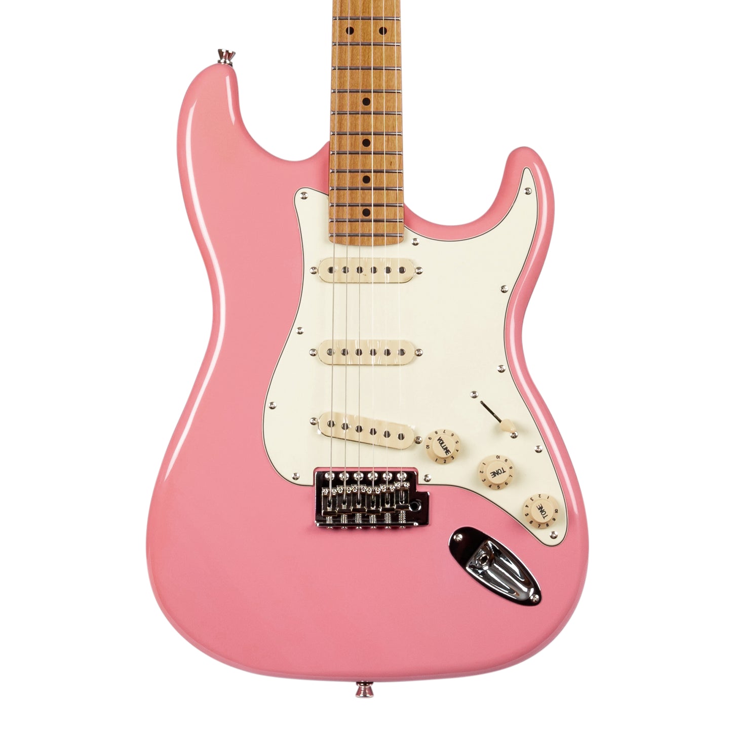 The guitar boasts features never, ever seen in a guitar at the price, such as a bone nut, roasted Canadian maple neckwith a smooth satin finish, a 9.5" radius roasted maple fingerboard, high quality chrome plated hardware including a vintage style tremolo system.