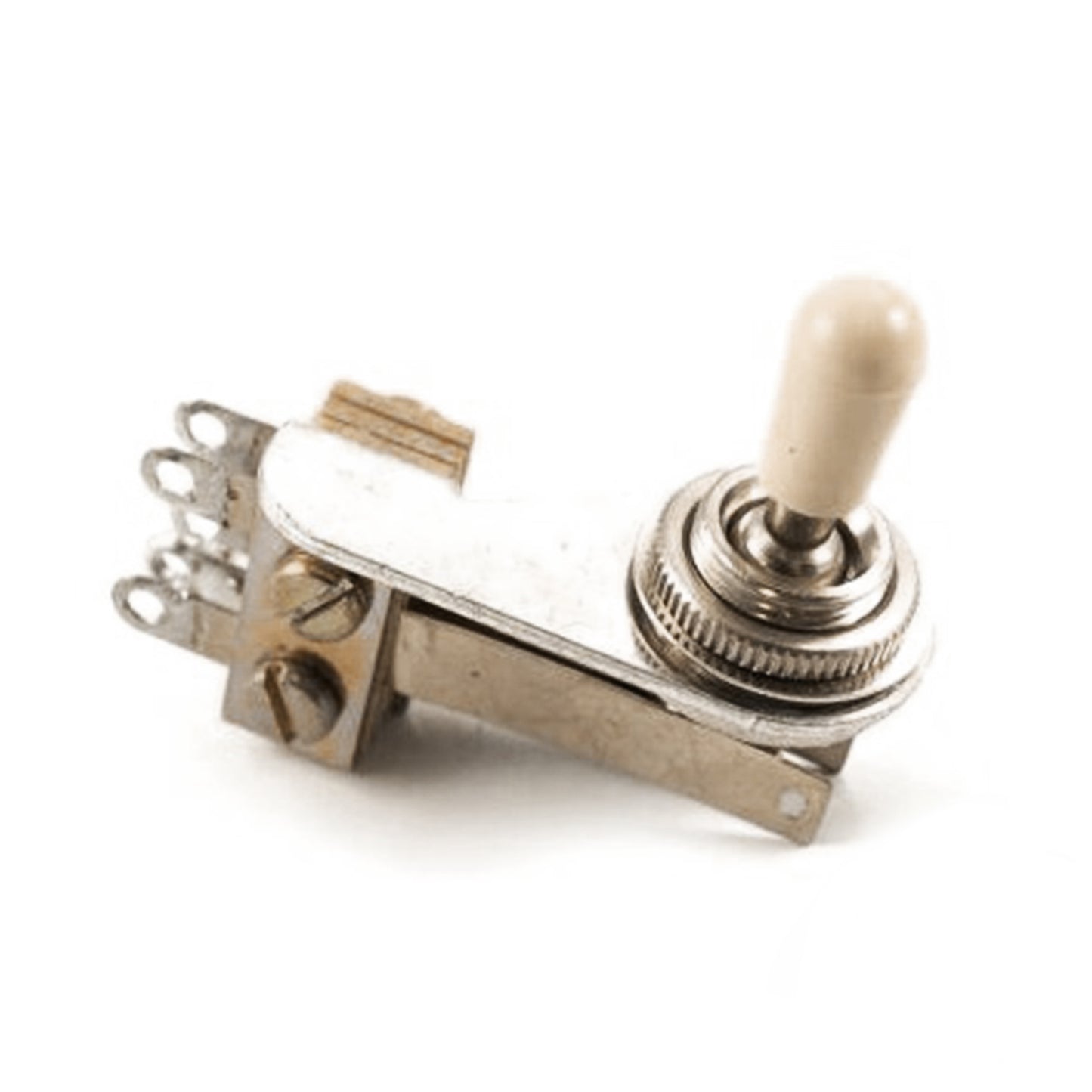 This is the switch used on many USA-made Gibson SGs, Explorers, and ES-models including the ES-335. It is a right-angle switch with a short 5mm threaded collar. A Switchcraft 'deep thread nut' might be required for guitars with thicker tops (sold separately).
